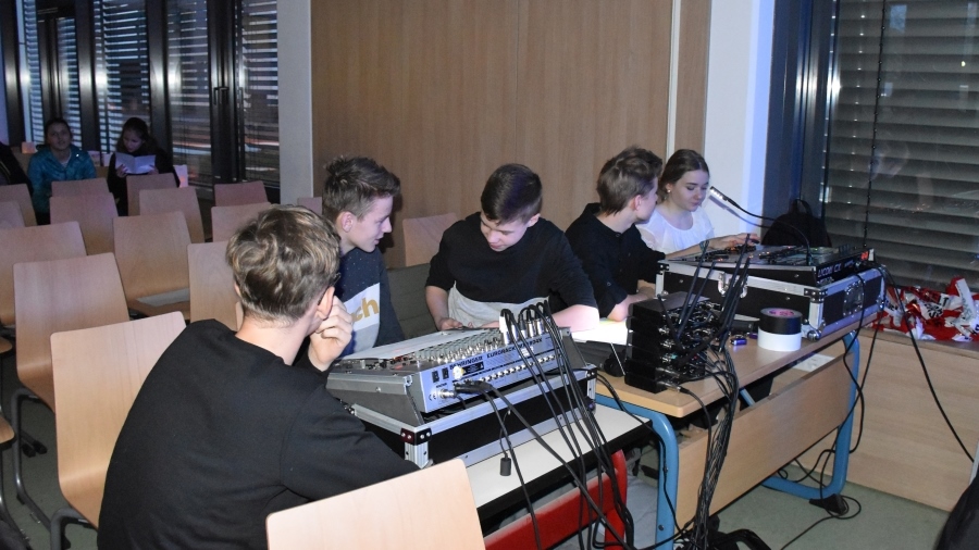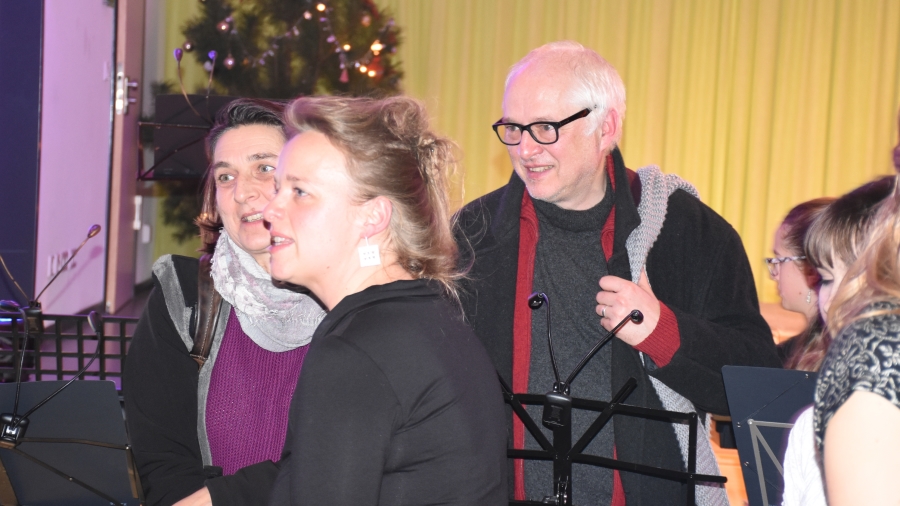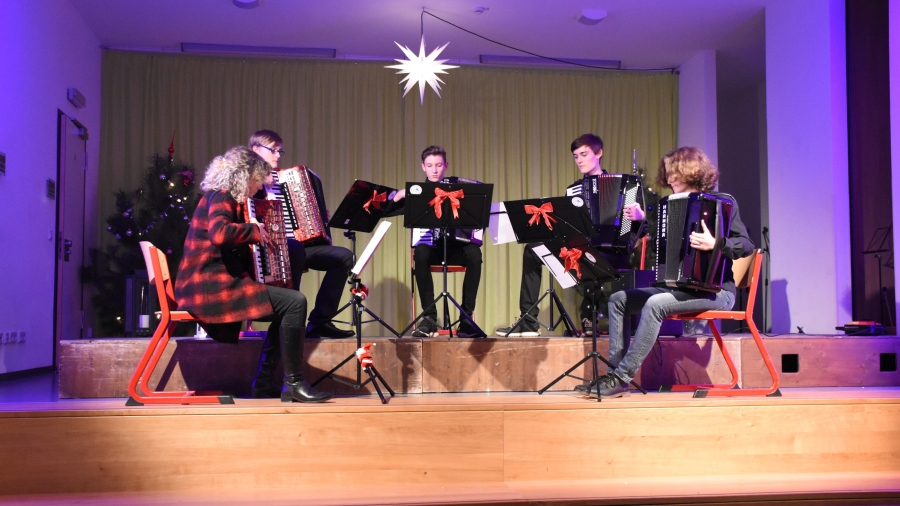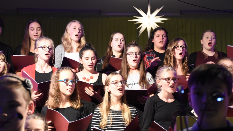 Wow. Das ist ja wieder wie bei Wissen vor acht. Mit einigen weihnachtlichen Melodien erfreuen uns nun unser Schulchor und die Instrumentalgruppe, nämlich "Als ich bei meinen Schafen wacht" und "Ich steh an deiner Krippen hier", sowie "In dulci jubilo" und weiteren Liedern aus Spanien, Italien und Chile.