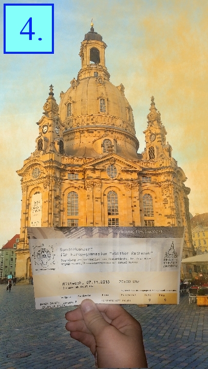 Reicht bis zu drei eurer schönsten Bilder von unserem Tag in Dresden bei uns ein. Wir erwarten euch ab dem 9. November 2018 (Freitag) in den großen Pausen nach der 5. Stunde und donnerstags in der 7. Stunde im Raum D 106. Die Bilder von eurem Stick übertragen wir sofort auf unseren Laptop. Das war's dann schon für euch als Teilnehmer. Letzter Abgabetermin ist der 15. November 2018 (Donnerstag). Bitte denkt auch an den Datenschutz (Einverständniserklärung, wenn Personen abgebildet werden).