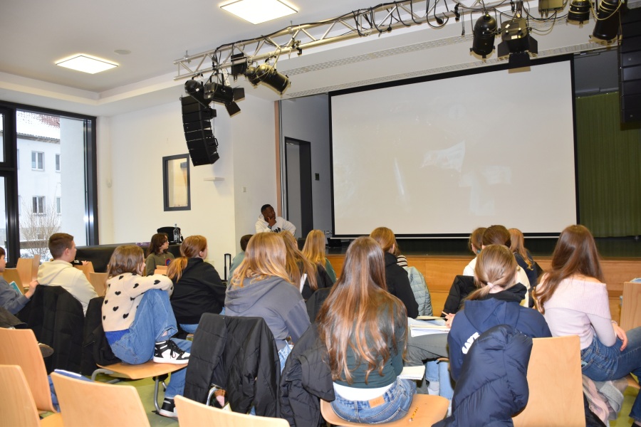 Der Jahrgang 7 arbeitet praxis- und handlungsorientiert. Ein Musikworkshop mit dem Rapper Matondo eröffnet den Tag. Ergänzt wurde das Programm durch Europarallyes sowie Workshops zu Konfliktbewältigung und Kinderrechten.